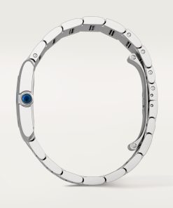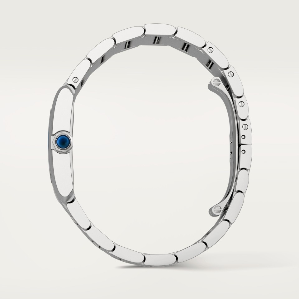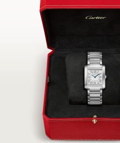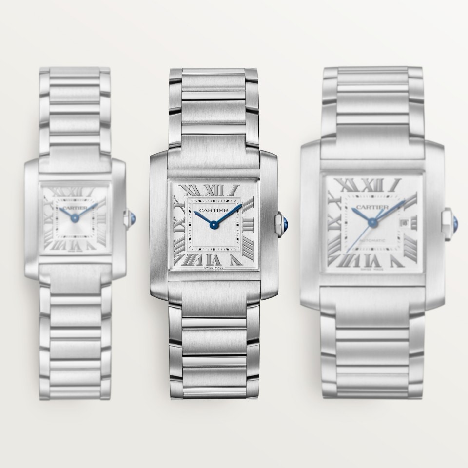 Tank Française watch, medium model, quartz movement. Steel case. Faceted crown in steel decorated with a synthetic cabochon-shaped spinel. Silvered dial, blued-steel sword-shaped hands, sapphire crystal. Steel bracelet. Case dimensions: 32 mm x 27 mm, thickness: 7.1 mm. Water-resistant to 3 bar (approx. 30 meters/100 feet).