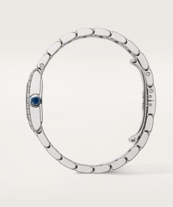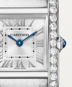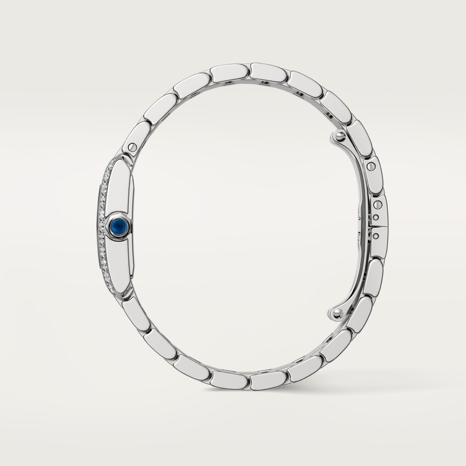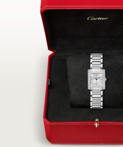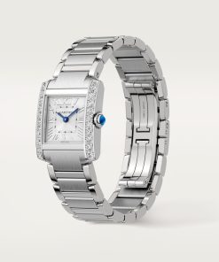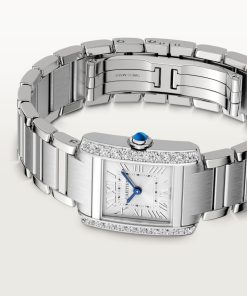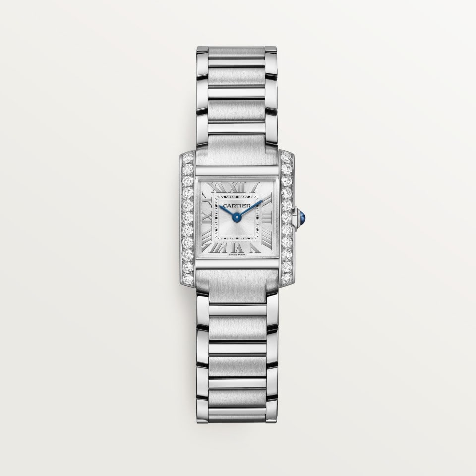 Tank Française watch, small model, quartz movement. Steel case set with 22 diamonds totaling 0.70 carats, steel faceted crown with a synthetic blue cabochon-shaped spinel. Silvered sunray dial, blued-steel sword-shaped hands, sapphire crystal. Steel bracelet. Case dimensions: 25.7 mm x 21.2 mm, thickness: 6.8 mm. Water-resistant up to 3 bar (approx. 30 meters/100 feet).