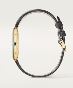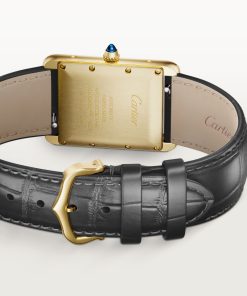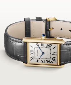 Tank Louis Cartier watch, large model, mechanical movement with automatic winding, caliber 1899 MC. 18K yellow gold (750/1000) case. Dimensions: 38.1 x 27.75 mm, thickness: 8.18 mm. Stamped silvered dial with yellow varnish. 18K yellow gold (750/1000) beaded crown set with a sapphire cabochon. Blued-steel sword-shaped hands. Semi-matte gray alligator leather strap. Water-resistant up to 3 bar (approx. 30 meters/100 feet).