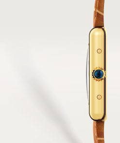 Tank Louis Cartier watch, small model, quartz movement. 18K yellow gold (750/1000) case, beaded crown set with a sapphire cabochon, silver-grained dial, blued-steel sword-shaped hands, mineral crystal, alligator-skin strap 18K yellow gold (750/1000) ardillon buckle. Case dimensions: 29.5 mm x 22 mm, thickness: 6.35 mm. Water-resistant up to 3 bar (30 meters/100 feet).
