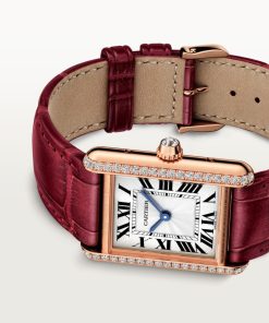 Tank Louis Cartier watch, small model, Manufacture mechanical movement with manual winding. Case and beaded crown in 18K rose gold (750/1000) set with 41 brilliant-cut diamonds totaling 0.47 carat. Silver-grained dial, blued-steel sword-shaped hands, mineral crystal, claret alligator-skin strap, ardillon buckle in 18K rose gold (750/1000). Case dimensions: 29.5 mm x 22.0 mm. Thickness: 6.8 mm. Water-resistant up to 3 bar (approx. 30 meters/100 feet).