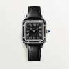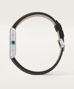 Tank Must watch, small model, High Autonomy quartz movement. Steel case, bezel set with 40 brilliant-cut diamonds totaling 0.39 carats, beaded crown set with a synthetic cabochon-shaped spinel, silvered dial, blued-steel sword-shaped hands, interchangeable black brushed calfskin strap, steel ardillon buckle. Case dimensions: 29.5 mm x 22 mm, thickness: 6.6 mm. Water-resistant up to 3 bar (approx. 30 meters/100 feet).