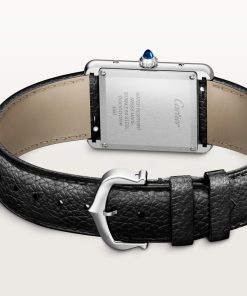 Tank Must watch, large model, SolarBeat™ photovoltaic movement. Steel case, beaded crown set with a synthetic cabochon-shaped spinel, silvered dial, blued-steel sword-shaped hands, black strap (calfskin), steel ardillon buckle. Case dimensions: 33.7 x 25.5 mm, thickness: 6.6 mm. Water-resistant up to 3 bar (approx. 30 meters/100 feet).