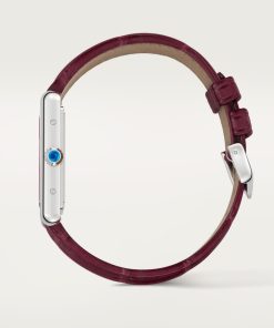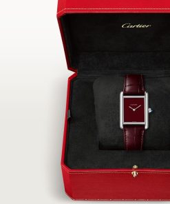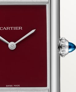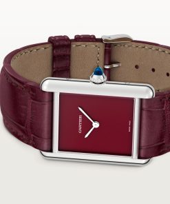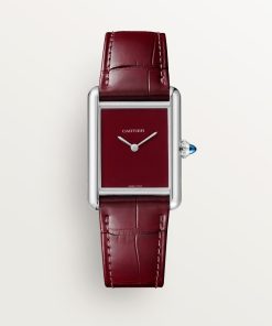 Tank Must watch, large model, High Autonomy quartz movement. Steel case, beaded crown set with a synthetic cabochon-shaped spinel, claret lacquered dial, polished steel sword-shaped hands, claret alligator leather strap, steel ardillon buckle. Case dimensions: 33.7 x 25.5 mm, thickness: 6.6 mm. Water-resistant up to 3 bar (approx. 30 meters/100 feet).