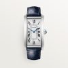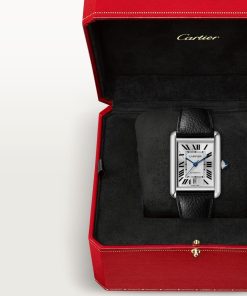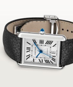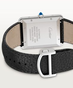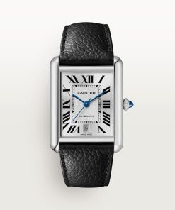 Tank Must watch, extra-large model, Manufacture mechanical movement with automatic winding, caliber. Steel case, beaded crown set with a synthetic cabochon-shaped spinel, silvered flinqué dial, blued-steel sword-shaped hands, interchangeable black grained calfskin strap, interchangeable steel deployant buckle, calendar aperture at 6 o’clock. Case dimensions: 41 mm x 31 mm, thickness: 8.4 mm. Water-resistant up to 3 bar (approx. 30 meters/100 feet).