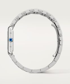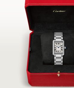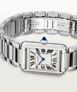Tank Must watch, small model, High Autonomy quartz movement. Steel case, beaded crown set with a synthetic cabochon-shaped spinel, silvered dial, blued-steel sword-shaped hands, interchangeable steel bracelet. Case dimensions: 29.5 x 22 mm, thickness: 6.6 mm. Water-resistant up to 3 bar (approx. 30 meters/100 feet).