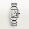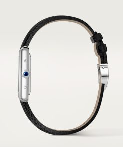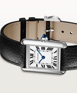 Tank Must watch, small model, SolarBeat™ photovoltaic movement. Steel case, beaded crown set with a synthetic cabochon-shaped spinel, silvered dial, blued-steel sword-shaped hands, black strap (calfskin), steel ardillon buckle. Case dimensions: 29.5 x 22 mm, thickness: 6.6 mm. Water-resistant up to 3 bar (approx. 30 meters/100 feet).