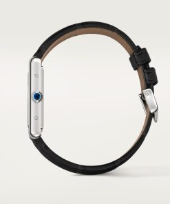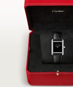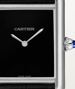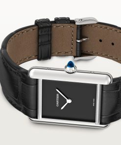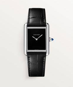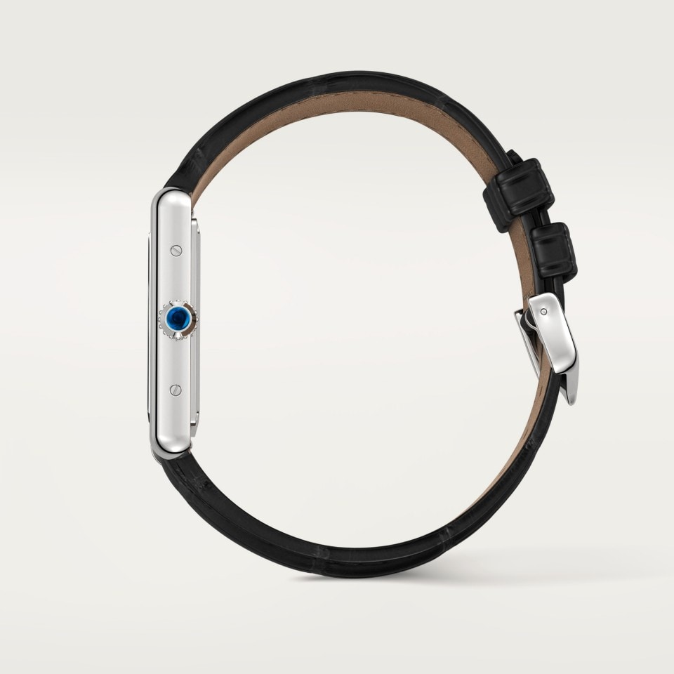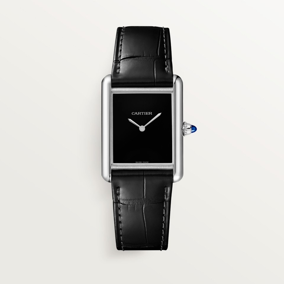 Tank Must watch, large model, High Autonomy quartz movement. Steel case, beaded crown set with a synthetic cabochon-shaped spinel, black lacquered dial, rhodiumized steel sword-shaped hands, semi-matte black alligator leather strap, steel ardillon buckle. Case dimensions: 33.7 x 25.5 mm, thickness: 6.6 mm. Water-resistant up to 3 bar (approx. 30 meters/100 feet).
