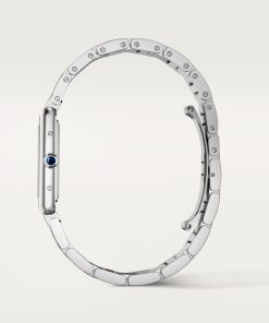Tank Must watch, large model, photovoltaic SolarBeat™ movement. Steel case, beaded crown set with a synthetic cabochon-shaped spinel, silvered dial, blued-steel sword-shaped hands, steel bracelet. Case dimensions: 33.7 x 25.5 mm, thickness: 6.6 mm. Water-resistant up to 3 bar (approx. 30 meters/100 feet).