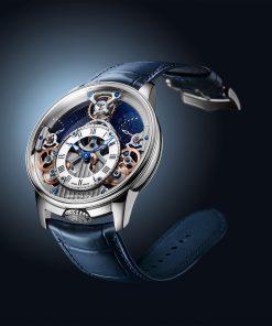 The Time Pyramid’s structure is intentionally exposed, showcasing the movement, finishes, and the screw balance at 12 o’clock. The caliber A&S1615, developed in-house, includes dual power-reserve indicators and boasts a 90-hour operating time without rewinding.