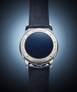 The case back features aventurine glass, embedded with copper inclusions, a material with origins in Venice’s glassmaking tradition. When not worn, the watch allows light to pass through, creating interplays of transparency and color. The dial features alternating gold-plated and NAC-treated finishes, with Côtes de Genève stripes.
