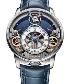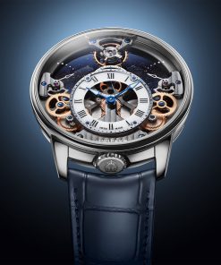 The design boasts a vertical arrangement of the watch’s inner workings, inspired by 1830s timepieces. The movement, reminiscent of a pyramid or an anchor, is skeletonized and visible through the case, which is 10.72 mm thick. Unique design elements include a crown at 6 o’clock and a non-traditional symmetrical layout.