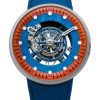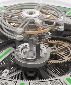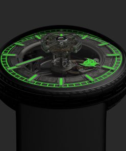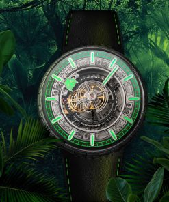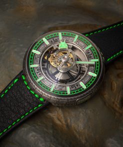 The design draws from key elements of the franchise and the film, featuring a central floating tourbillon movement and a unique display system. The watch’s case is decorated with intricate details from the movie, including Cybertronix language engravings.