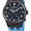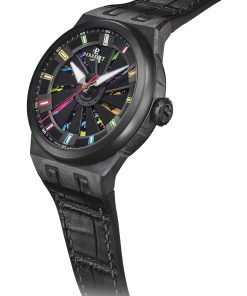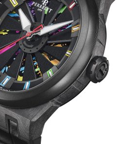 The Turbine Splash features a 44-mm black polycarbonate and forged carbon fiber case. The black PVD steel bezel, carbon fiber case middle with vertical grooves, and personalized crown enhance its powerful look. The watch has luminous dagger-shaped hands, a red central seconds hand, and colorful baton indices.