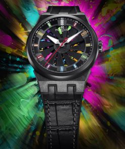 Perrelet unveiled its new creation, the Turbine Splash, at the Windup Watch Fair in Chicago from July 12-14, 2024. This 99-piece limited edition watch, characterized by vibrant splashes of color on its lower dial, showcases Perrelet’s innovative and artistic design. The colorful splashes, inspired by Jackson Pollock’s action painting technique, are partially revealed by the rotating turbine on the sub-dial. The 12-blade turbine, made from black anodized aluminum with tungsten micro-weights, spins with wrist movements, highlighting the colorful background.