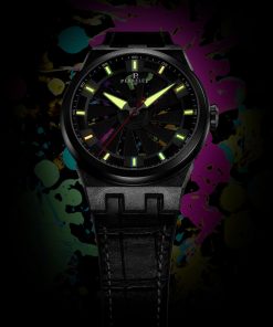 Powered by the P-331-MH caliber, it has a 42-hour power reserve, certified by COSC and Chronofiable® for accuracy and reliability. It comes with a black alligator-pattern leather strap, an extra black rubber strap, and a dedicated tactical box.