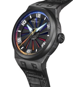 The 44mm case is made from a blend of polycarbonate and carbon fiber, making it both lightweight and comfortable to wear. It features a matte black PVD-coated stainless steel bezel and case back and is water-resistant up to 10 ATMs. Signature design details include vertical grooves along the case, a prominent crown with the Perrelet “P” logo, and a sapphire glass porthole on the case back that offers a glimpse of the beautifully refined movement. The limited-edition Turbine Sunset, capped at just 99 pieces, includes an engraved “xx/99” marking on the back.