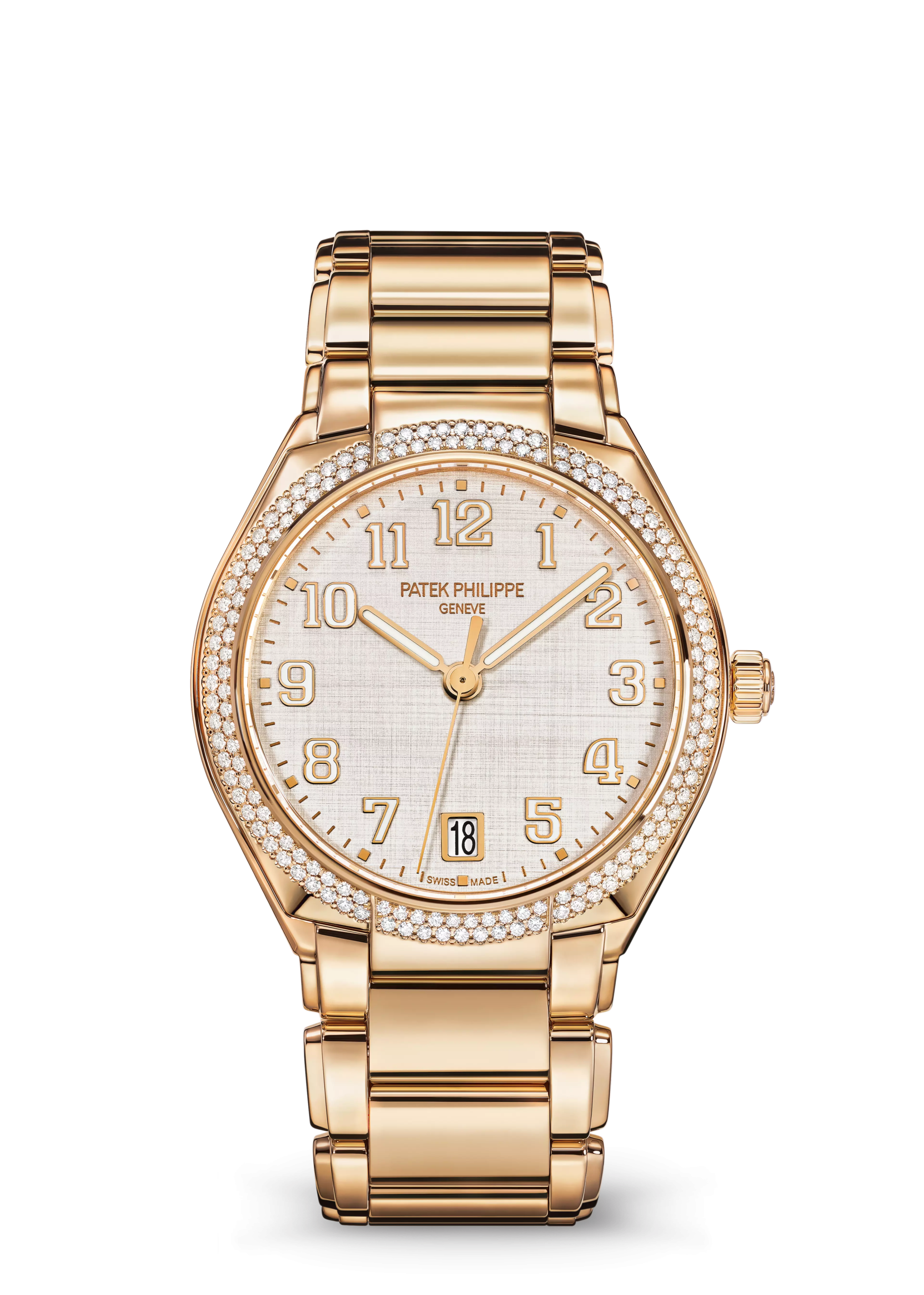 The silvery dial of this Twenty~4 Automatic in rose gold is enhanced by double vertical and horizontal satin-brushing reminiscent of shantung silk fabrics. This touch of feminine elegance is enhanced by the bezel set with diamonds arranged in two staggered rows. The self-winding movement can be admired through the sapphire crystal case-back.