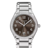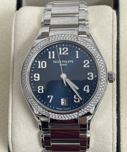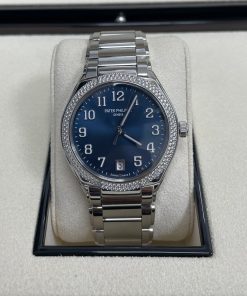 36 mm stainless steel case, 10.05 mm thick, sapphire-crystal back, bezel set with 160 diamonds (~0.77 ct), blue sunburst dial with gold applied numerals and luminescent hour markers, caliber 324 S C self-winding movement with date in an aperture and center sweep second hand, approximately 35-45 hours of power reserve, stainless steel bracelet, fold-over buckle. Water resistant to 30 m.