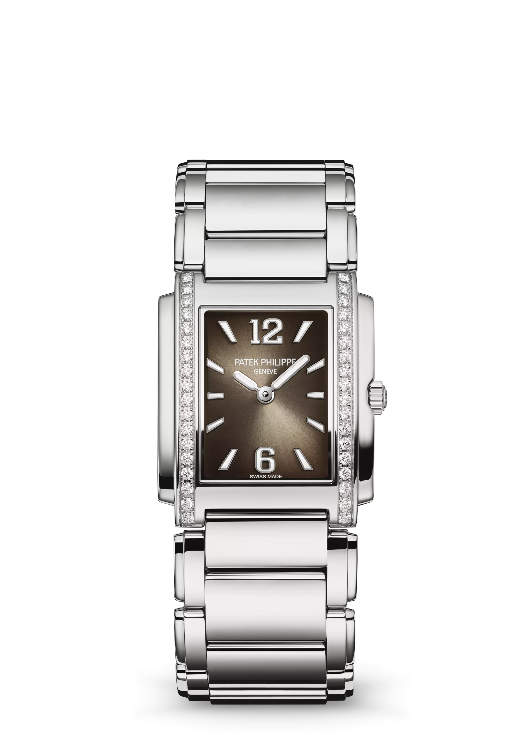 Suitable for any occasion, this Twenty~4 in diamond-set steel features an elegant gray dial enhanced by a black-gradient rim. The sunburst motif with fine grooves radiating from the center adds a dynamic, refined touch creating fascinating light effects. The crown is adorned with Patek Philippe’s Calatrava cross emblem.