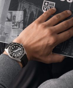 This Swiss-made watch features a full sandblasted 316L stainless steel case with a screw-down crown, measuring 39.5mm in diameter and 14.4mm in height. A double-domed sapphire crystal with double anti-reflective coating ensures exceptional legibility in any light. The dial is enhanced with BW G9 Super-LumiNova on its markers and hands, while the bi-directional sandblasted bezel with an aluminum inner ring provides reliable timing functionality.