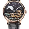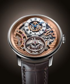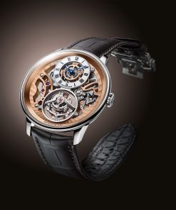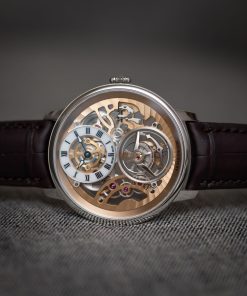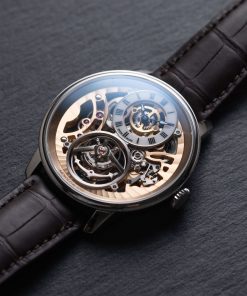 The Ultrathin Tourbillon Skeleton from Arnold & Son is available in either red gold or platinum, each limited to only 28 pieces. The timepiece has a 41.5 mm case with a remarkable thinness of just 8.4 mm, framing the A&S8320 calibre, one of the slimmest skeleton tourbillon movements at 3.3 mm. Precision engineering is evident with its variable-inertia balance, ensuring superior calibration stability.