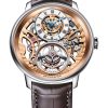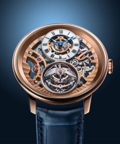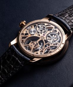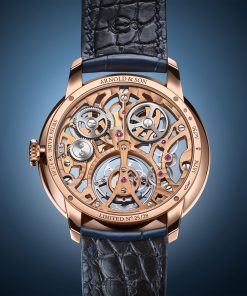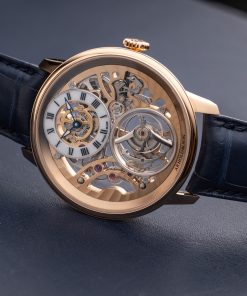 The Ultrathin Tourbillon Skeleton from Arnold & Son is available in either red gold or platinum, each limited to only 28 pieces. The timepiece has a 41.5 mm case with a remarkable thinness of just 8.4 mm, framing the A&S8320 calibre, one of the slimmest skeleton tourbillon movements at 3.3 mm. Precision engineering is evident with its variable-inertia balance, ensuring superior calibration stability.
