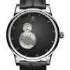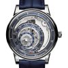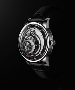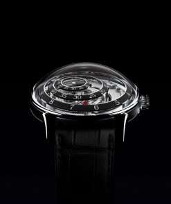 The rotating hours, minutes, and seconds rings rise 10.2 mm above the movement, supported by a masterfully engineered titanium structure. Each ring is a feat of precision, constructed from titanium-aluminum-vanadium—an ultra-light yet challenging material to shape and polish. Nine columns uphold this floating display, topped by a flawless Japanese-crafted sapphire dome.