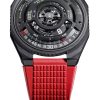 Innovatively, the Urwerk UR-230 “Eagle” integrates shock absorbers to protect its calibre via turbines, with a unique “air brake” system that modulates winding power based on activity levels. These adjustments are indicated on the case, which also preserves the iconic URWERK design with its trapezoidal shape and nuanced angles.