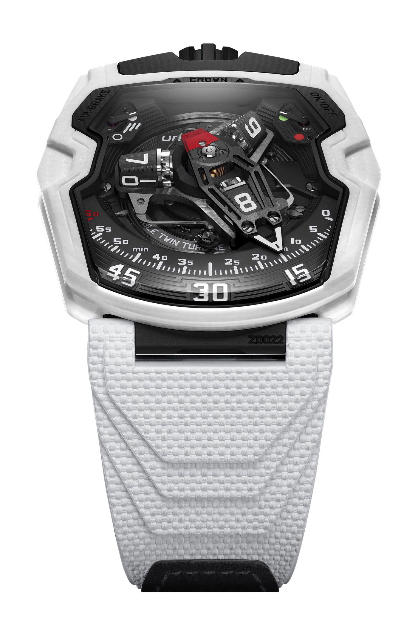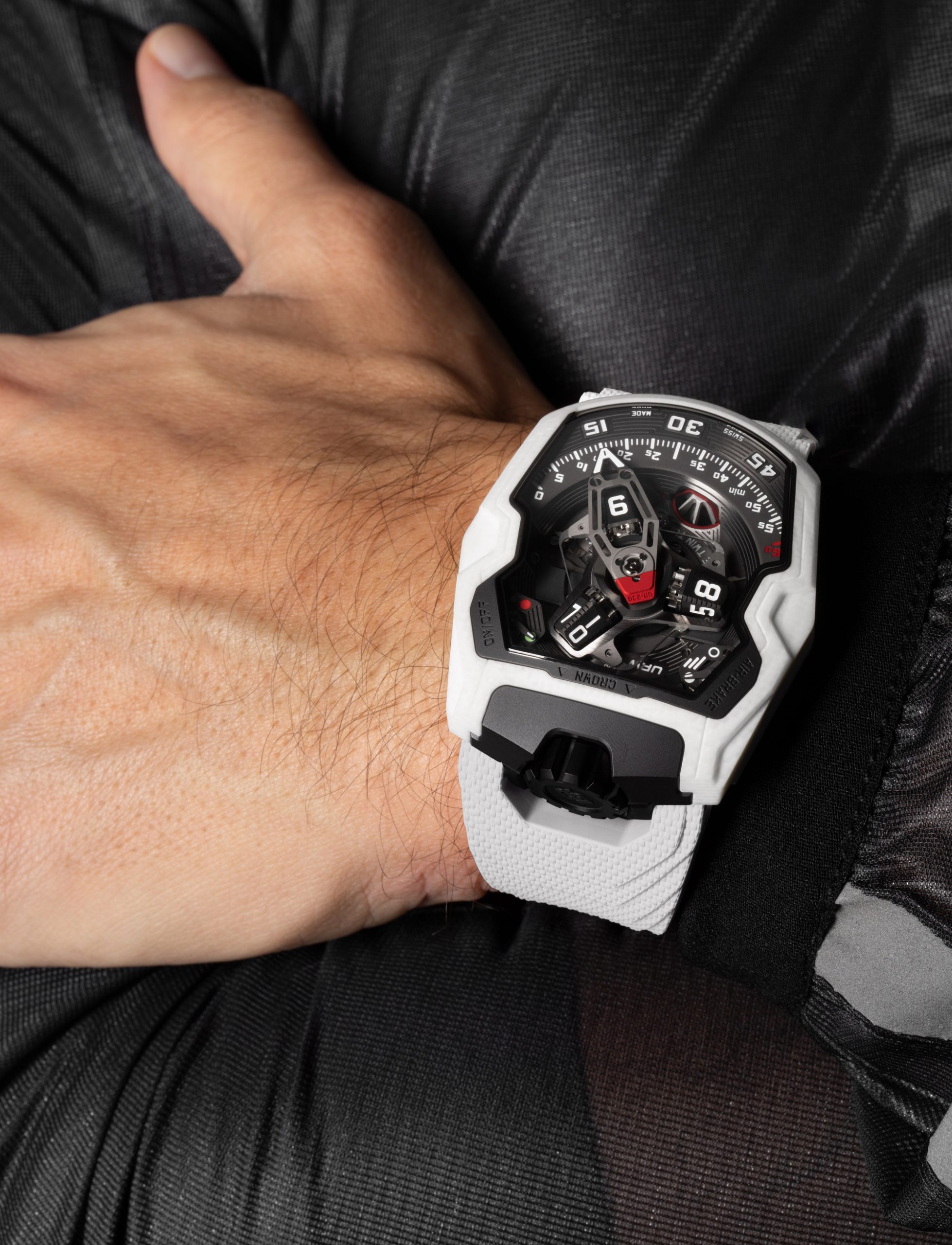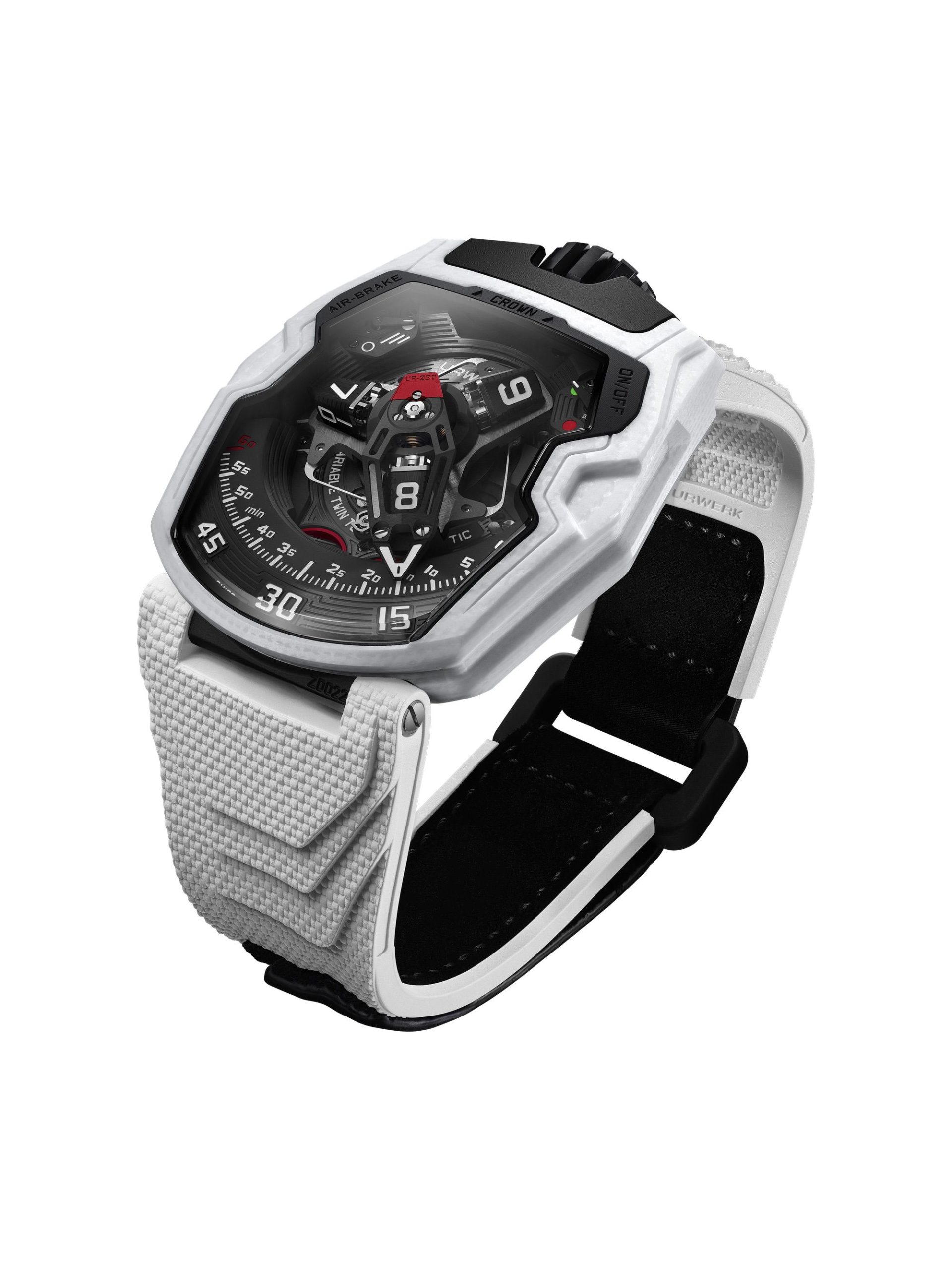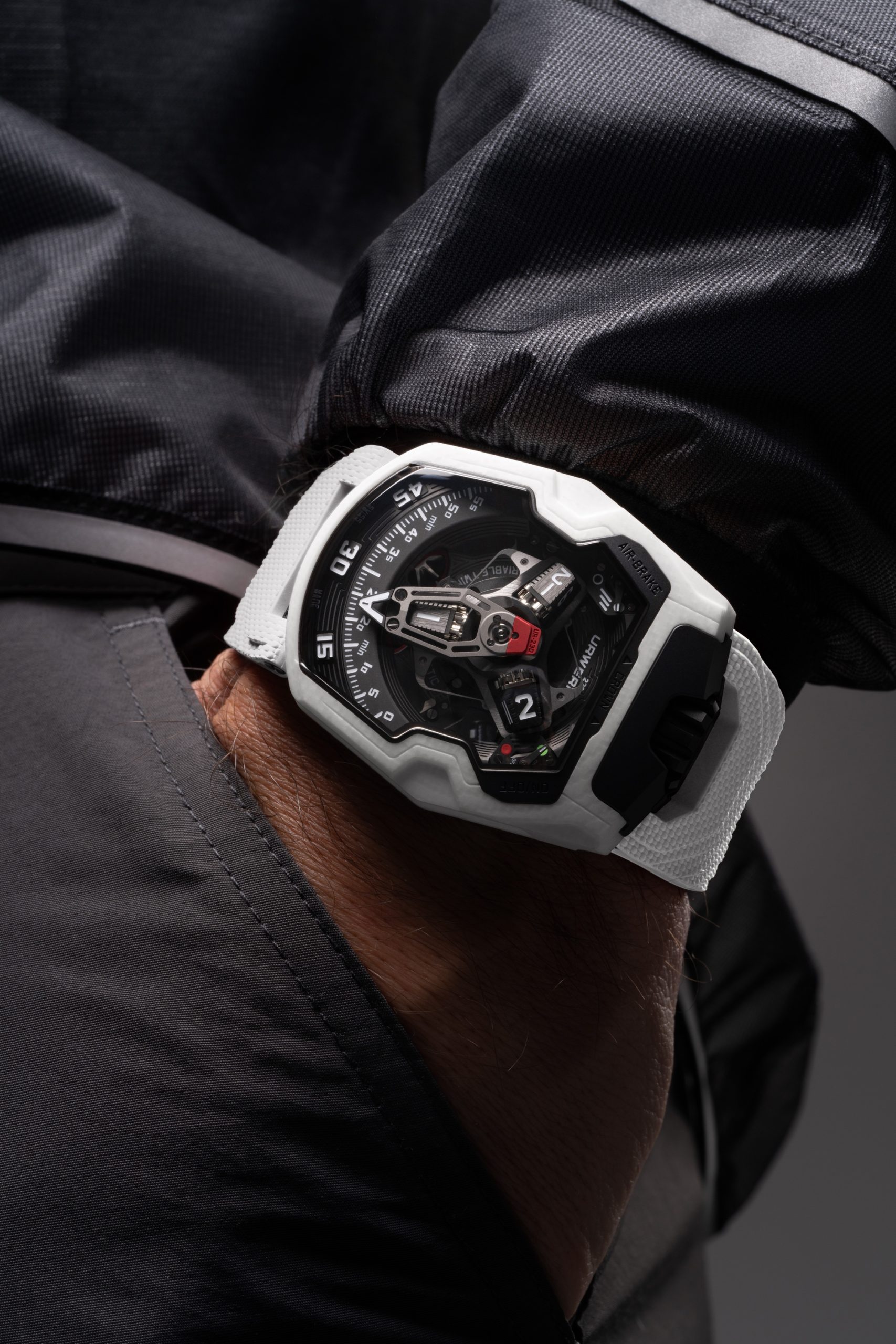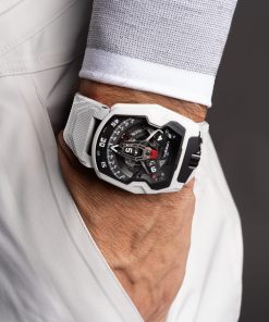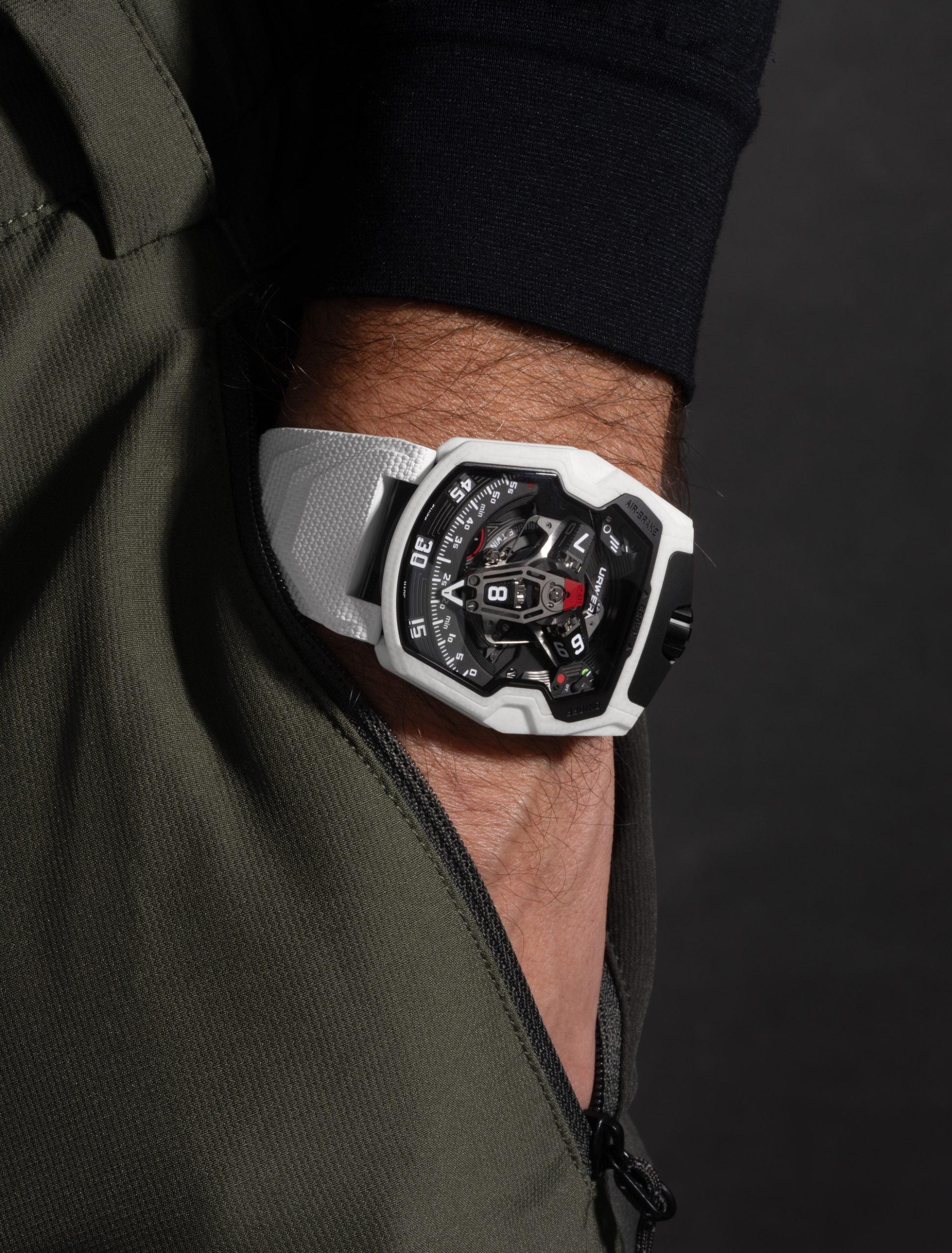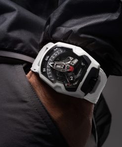 Functionally, the watch features URWERK’s signature revolving satellite hour display with a retrograde minute hand, designed in white to match the case. It introduces innovative shock absorbers and air-regulation turbines to protect the movement and optimize winding efficiency. A dual-switch mechanism allows the wearer to control the winding system and transition to manual mode.