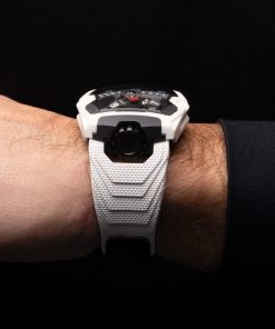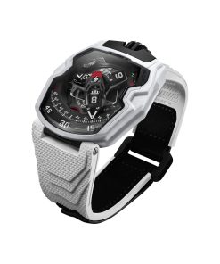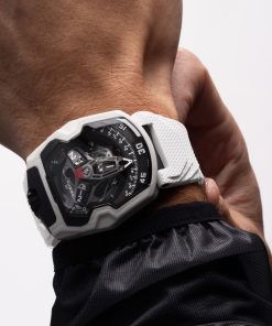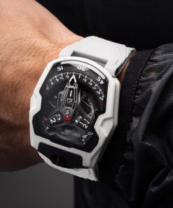 The UR-230 Polaris design incorporates a bold design inspired by the space-age imagery of 2001: A Space Odyssey and NASA’s Apollo missions. A white exterior contrasts with a black UR-7.30 caliber movement, housed in a trapezoidal case with precise design elements, including a crown at 12 o’clock and sapphire apertures.