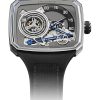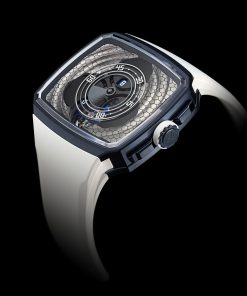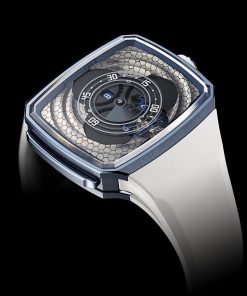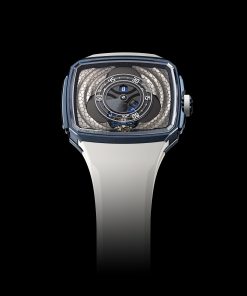 The case, water-resistant to 10 ATM, is coated in a deep midnight blue PVD, complemented by a bright white rubber strap and notched crown. The watch is powered by the D30 automatic movement, visible through the sapphire display back. This movement, with a bidirectional pawl winding mechanism, ensures a power reserve of at least 3 days and features a one-minute flying tourbillon with a double hairspring, produced by Precision Engineering AG. The Vagabonde Tourbillon Series 3 not only displays time but also showcases HAUTLENCE’s commitment to artistic and technical mastery in watchmaking.