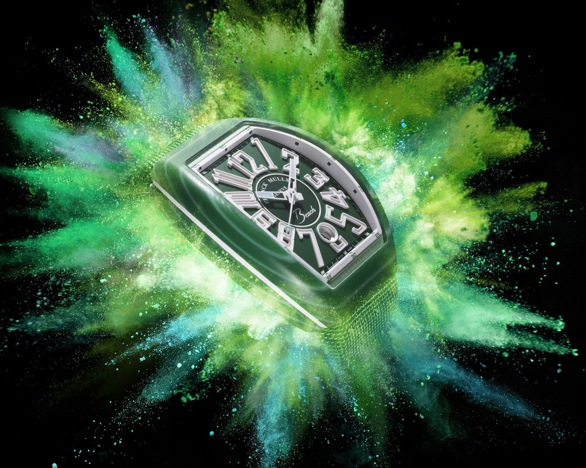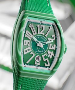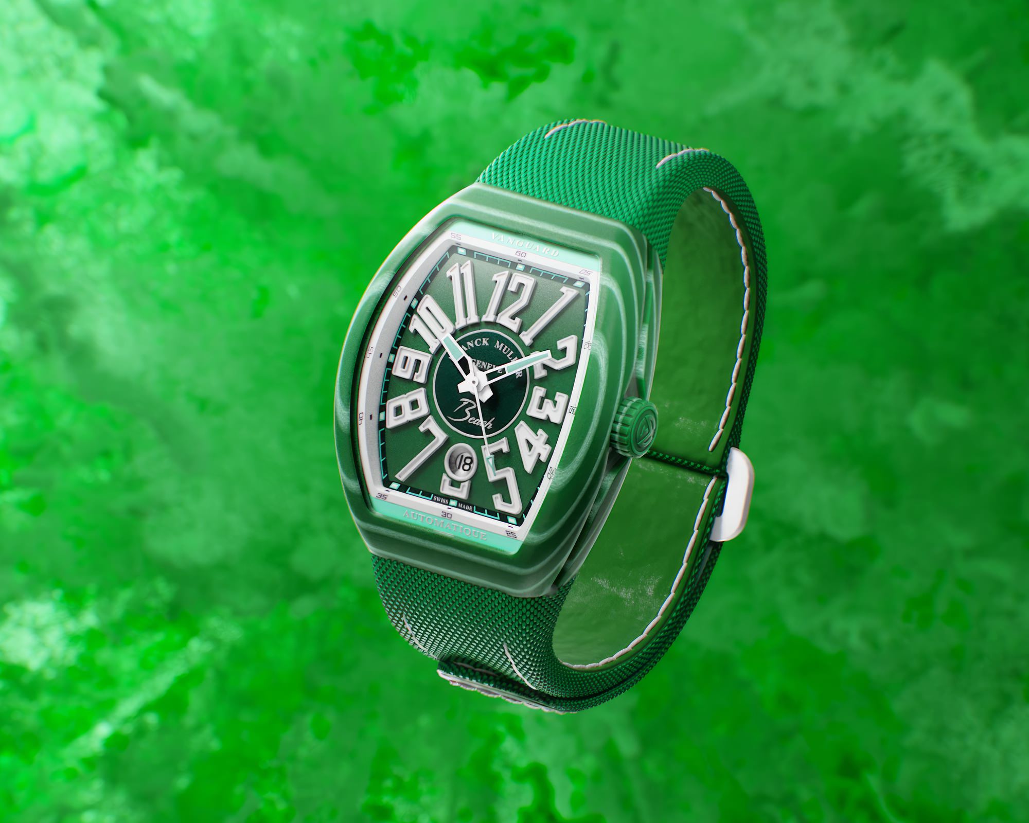 Franck Muller’s mastery in design and material engineering is showcased in the Vanguard Beach line. Each watch in the collection features a case crafted from a glass fiber composite, skillfully manipulated to create patterns resembling undulating ripples of beach sands. The exacting process involves melting glass at 1,500°C, drawing it into ultra-fine filaments, and layering these to form durable blocks, which are then meticulously machined into watch cases. This innovative application of materials not only contributes to the collection’s unique aesthetic but also ensures that each piece is lightweight and robust, with the glass fiber composite cases having just a quarter of the density of steel while maintaining comparable mechanical strength.
