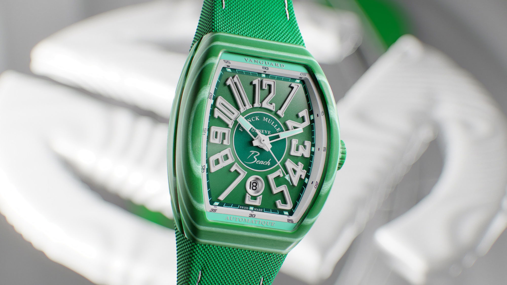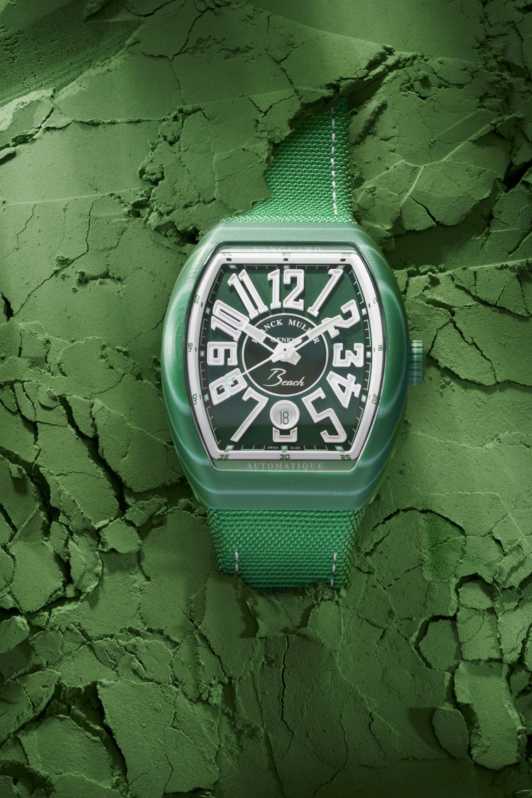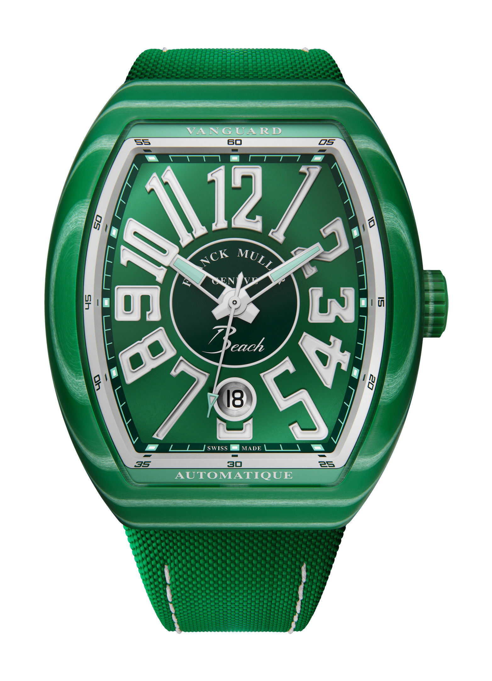 Franck Muller’s audacious new Vanguard Beach Collection resonates with the vibrant energies of beach holidays, embodying the essence of the sun, surf, and sand in each beautifully designed timepiece. The collection offers a brilliant array of monochromic watches in fiery red, ocean blue, and summer green, ingeniously blending sporty elegance with the brand’s iconic curved tonneau case.
