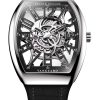 Franck Muller’s iconic numerals enhance the design, appearing to float above the skeleton movement, adding to the watch’s aesthetic appeal. The dials are produced with exceptional care at Franck Muller’s Dial Manufacture in Les Bois, Jura, requiring detailed attention, particularly for the openworked skeleton dial.