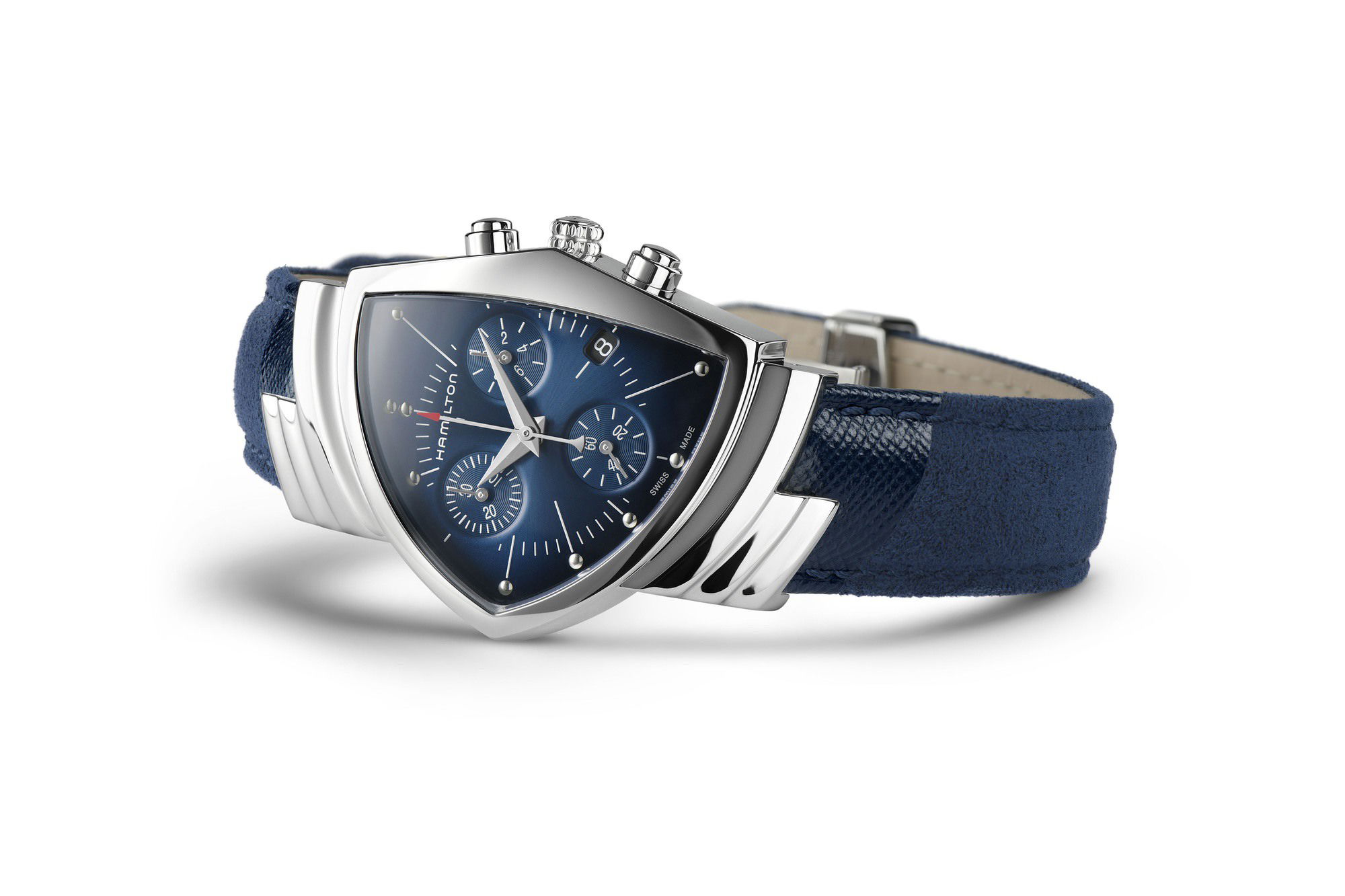 The Ventura Collection is an elegant tribute to Elvis Presley and his timeless hit “Blue Suede Shoes,” reimagining the Ventura, the world’s first electric watch that debuted in 1957. This Mid-Century Modern masterpiece, beloved by Presley and featured in his film “Blue Hawaii,” is revived in six new models, capturing the essence of the iconic song. Each model showcases a gradient blue dial, symbolizing the vibrancy of Presley’s impact on music and style.