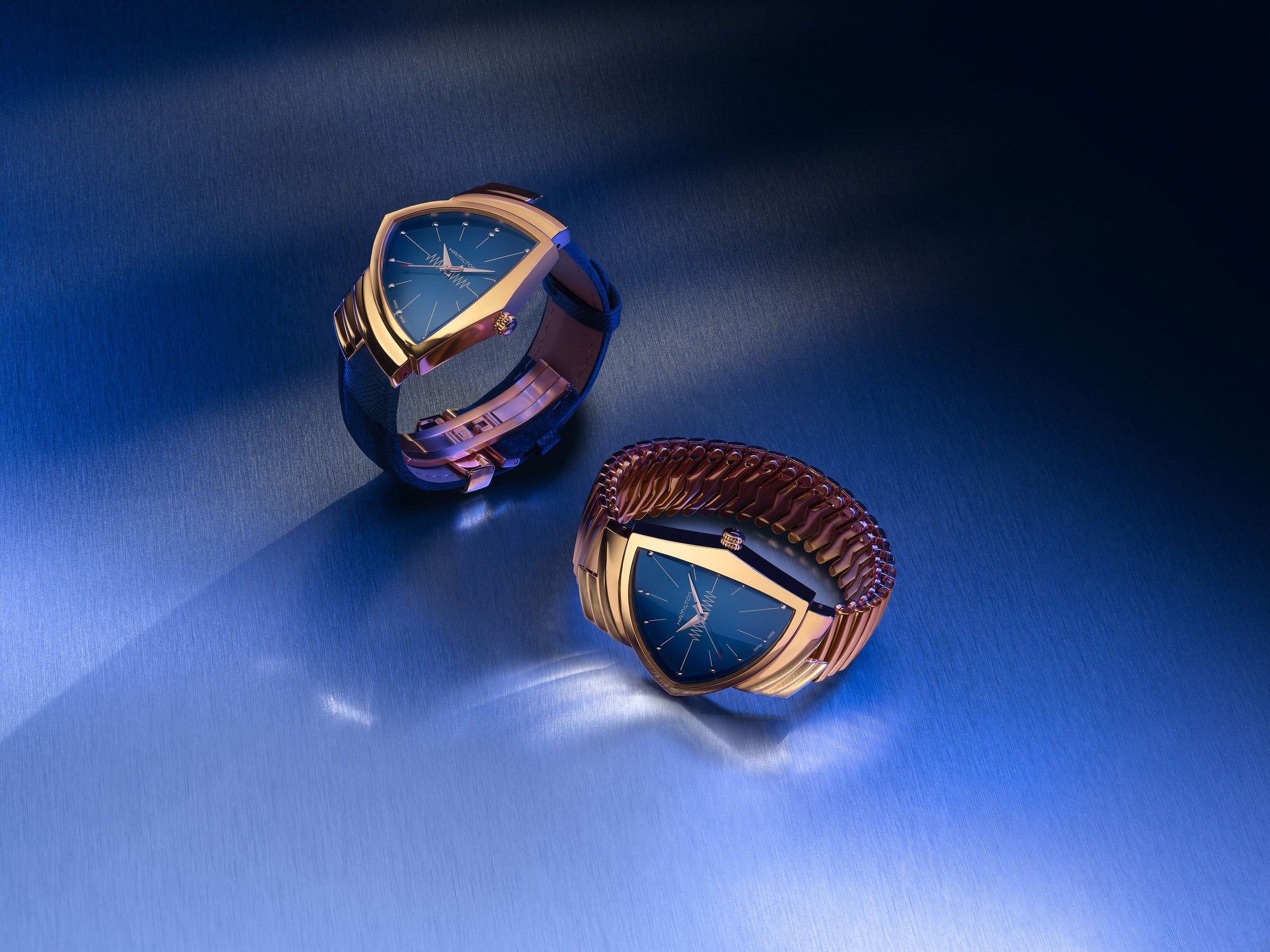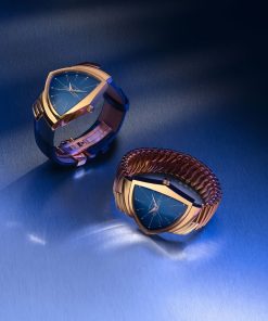 The Ventura Collection is an elegant tribute to Elvis Presley and his timeless hit “Blue Suede Shoes,” reimagining the Ventura, the world’s first electric watch that debuted in 1957. This Mid-Century Modern masterpiece, beloved by Presley and featured in his film “Blue Hawaii,” is revived in six new models, capturing the essence of the iconic song. Each model showcases a gradient blue dial, symbolizing the vibrancy of Presley’s impact on music and style.