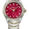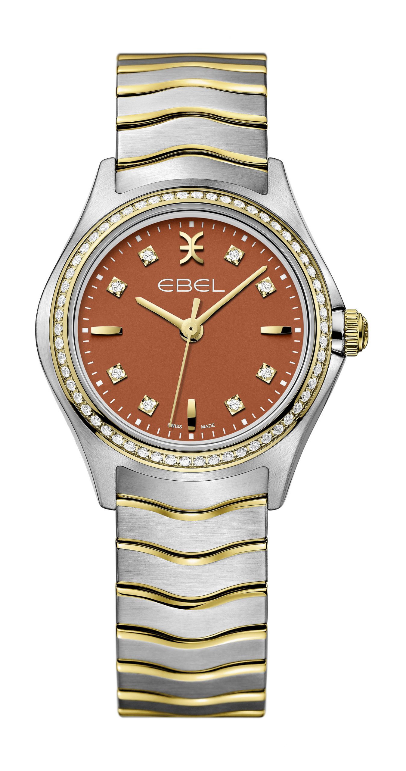 Women’s EBEL Wave watch, 30 mm stainless steel and 18K yellow gold case with 58 diamonds (0.377ct), ocher mat dial with 8 diamonds (0.052ct) and applied indexes, sapphire crystal with antireflective treatment underneath, two-tone stainless steel wave link bracelet, Swiss quartz movement, water-resistant up to 5 bar