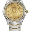 Women’s EBEL Wave watch, 30 mm stainless steel and 18K yellow gold case with 58 diamonds (0.377cts), green mother-of-pearl dial with 8 diamonds (0.052ct) and applied indexes, sapphire crystal with antireflective treatment underneath, two-tone stainless steel wave link bracelet, Swiss quartz movement, water-resistant up to 5 bar
