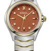 Women’s EBEL Wave watch, 30 mm stainless steel and 18K yellow gold case, ivory mat dial with 8 diamonds (0.052ct) and applied indexes, sapphire crystal with antireflective treatment underneath, two-tone stainless steel wave link bracelet, Swiss quartz movement, water-resistant up to 5 bar
