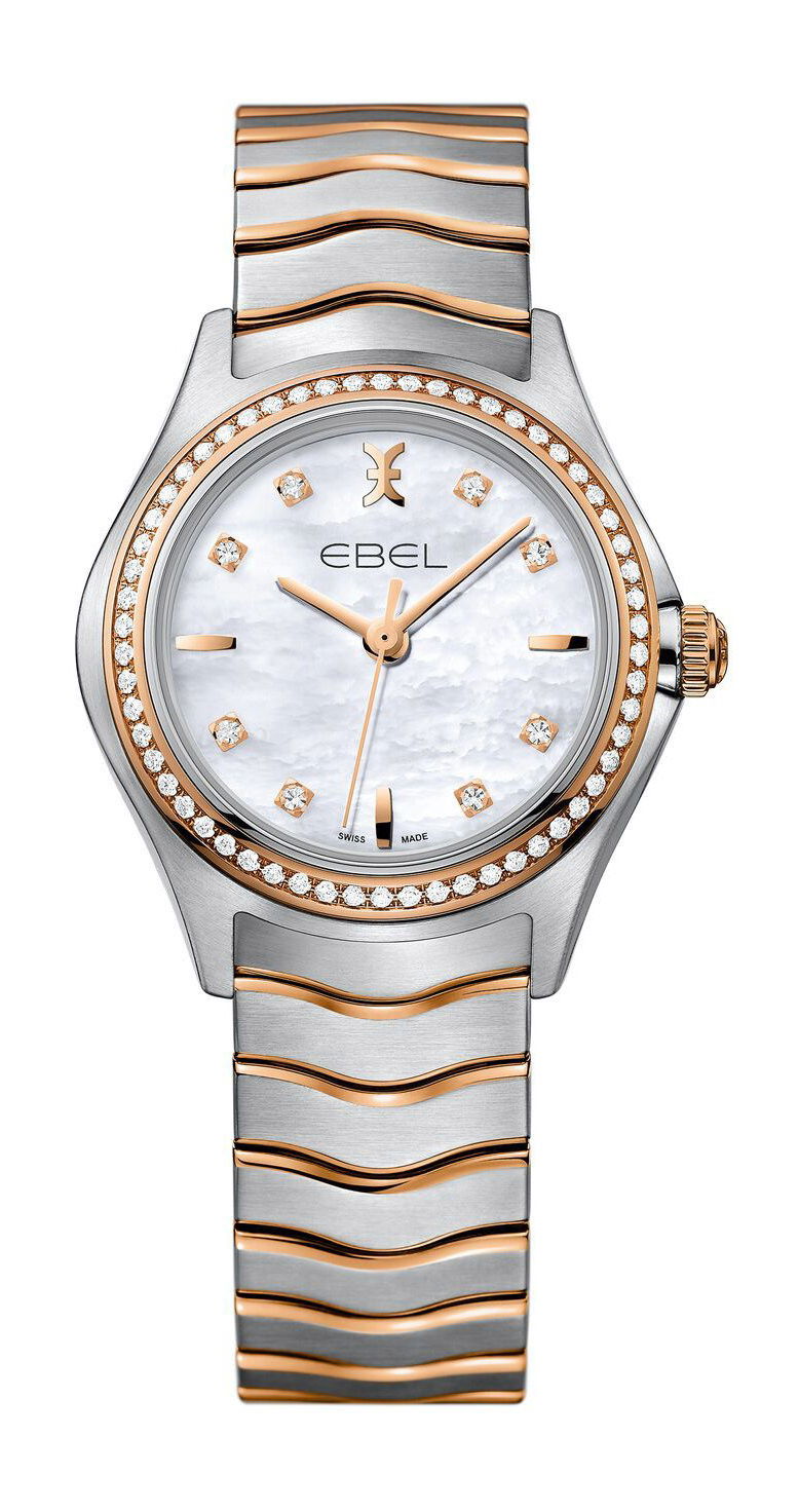 Women’s EBEL Wave watch, 30 mm stainless steel case with 58-diamond 18K pink gold bezel and 18K pink gold crown, white mother-of-pearl dial with 8 diamond markers and applied EBEL symbol and indexes, (0.429 t.c.w. diamonds), brushed and polished two-toned stainless steel signature wave-link bracelet with deployment clasp.
