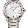 Women’s EBEL Wave watch, 30 mm brushed and polished stainless steel case, blue galvanic dial with 8 diamond markers (0.052 t.c.w.) and applied EBEL symbol and indexes, brushed and polished stainless steel signature wave-link bracelet with deployment clasp.