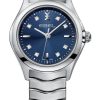 Women’s EBEL Wave watch, 30 mm stainless steel case with 18K rose gold bezel and crown, white mother-of-pearl dial with 8 diamond markers (0.052 t.c.w.) and applied EBEL symbol and indexes, brushed and polished two-toned stainless steel signature wave-link bracelet with deployment clasp.
