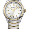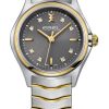 Women’s EBEL Wave watch, 30 mm stainless steel case with 18K yellow gold bezel and crown, brown galvanic dial with 8 diamond markers (0.052 t.c.w.) and applied EBEL symbol and indexes, brushed and polished two-toned stainless steel signature wave-link bracelet with deployment clasp.