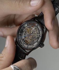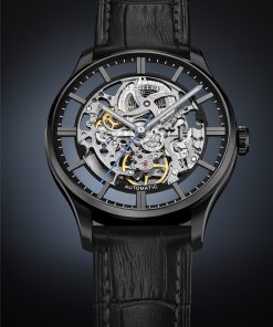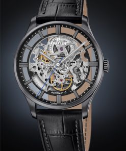 For the 2024 winter season, Perrelet has introduced a new model in their collection of men’s dress watches: the WEEKEND SKELETON. This piece features a skeletonized movement, a first for this line. The watch retains key features, such as a 39.5mm steel case with a thin profile (9.61mm) and water resistance up to 5 ATM. The polished and brushed steel case now sports a matt black PVD coating, enhancing the appeal of the skeleton movement visible through the anti-reflective sapphire crystal.