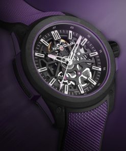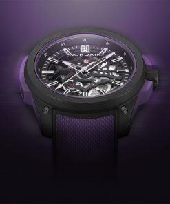 The watch builds on the Wild ONE’s signature case architecture: a NORTEQ® carbon fibre cage housing a shock-resistant purple rubber core, matched to a black-and-purple strap. At just 78 grams, it’s nearly half the weight of a steel equivalent. The skeletonised dial reveals the chronometer-certified Calibre NB08S, an automatic movement with ruthenium-black finishing, 41 hours of power reserve, and a custom rotor visible through the sapphire caseback.