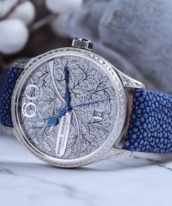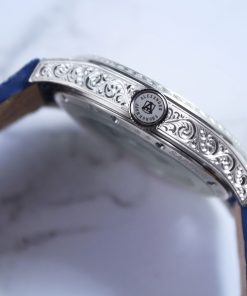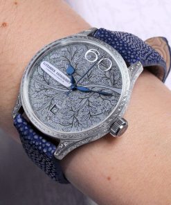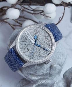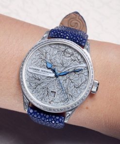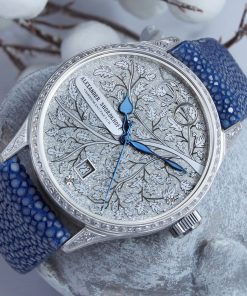 Alexander Shorokhoff has unveiled the Wintergenta, a spectacular timepiece that distinguishes itself with unique, detailed hand engravings on a real silver case. It features a dial embellished with diamond dust through a novel technique, creating a glistening effect reminiscent of diamond snow, and showcases a distinctive leaf motif, fully embodying the spirit of the anniversary. The Wintergenta transcends mere jewelry status, elevating it to a form of art. It boasts an exquisitely hand-engraved and decorated rotor within its automatic movement, which perfectly matches the hand-engraved 925 silver case measuring 39 millimeters in diameter, all protected by double-sided sapphire glass, reflecting Alexander Shorokhoff’s commitment to excellence. Ultimately, this piece emerges as a subtle and elegant watch that mesmerizes with its unique and forward-thinking design, available in a strictly limited edition of just 50 pieces.