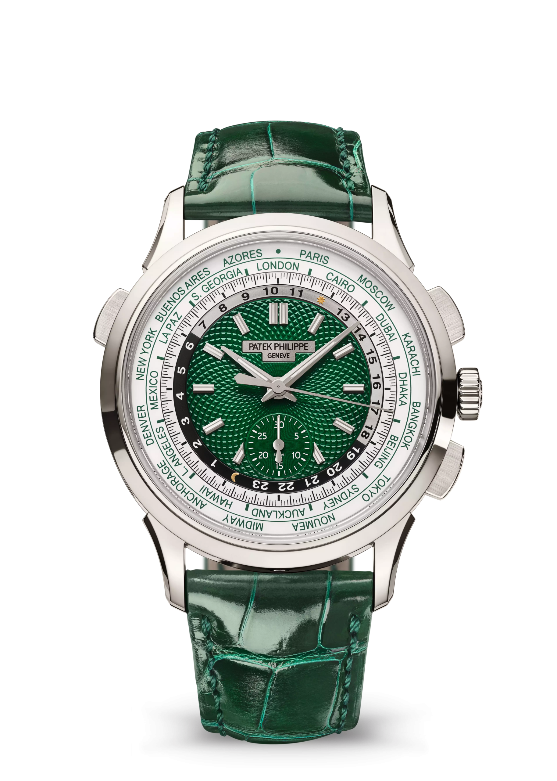 The self-winding flyback chronograph World Time Reference 5930 is offered in a brand-new version combining the brilliance of platinum with a green dial and strap – a blend of classicism and boldness that reinforces the personality of this cult model. The dial exemplifies mastery of Rare Handcrafts’ techniques with a circular, hand-guilloched decoration.
